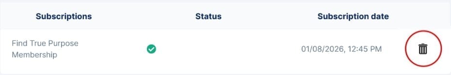 Email confirmation. Once you confirm, you will recieve an email confirming that your subscription to the Find True Purpose members section has been cancelled. You still have access for the month you've already paid for, but you will not be charged for any future months. As soon as your current month expires, you will lose access to the video series and workshops.